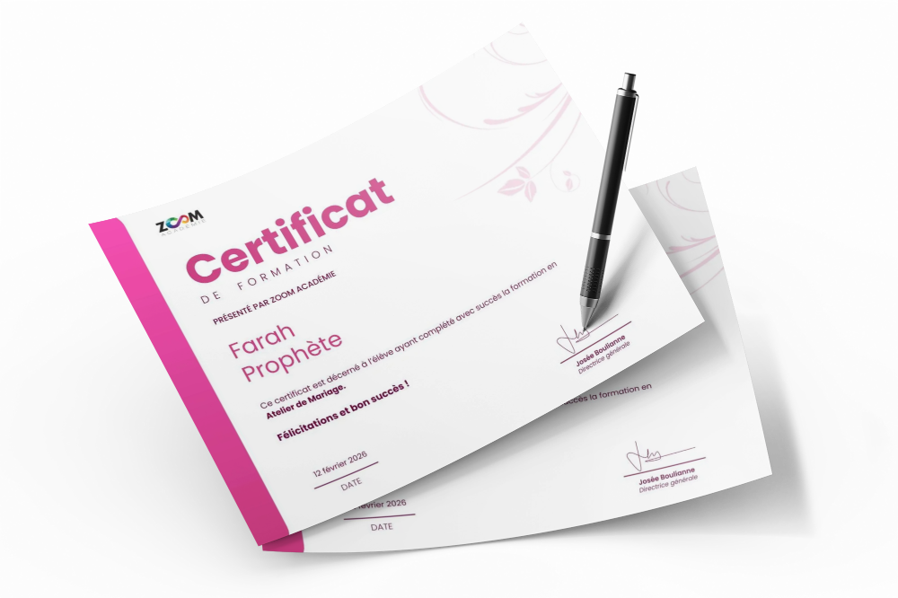 Une fois que vous avez terminé le programme, recevez un certificat officiel de Zoom Académie qui atteste de vos compétences en planification de mariage.